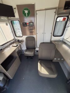 Mobilna stacja zapewnia komfortowe warunki dla inspektorów i osób kontrolowanych. Przedział biurowy jest klimatyzowany i ogrzewany. Są tu dwa biurka z zamykanymi szafkami oraz fotele dla 4 osób. Naturalne oświetlenie wewnątrz zapewniają duże okna na każdej ścianie. Osobno zamontowano sterowanie oświetleniem, agregat prądotwórczy oraz komputer obsługujący linię diagnostyczną.