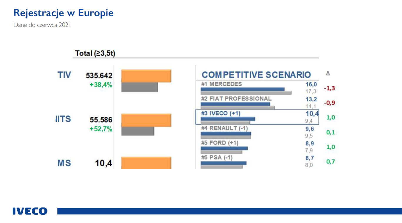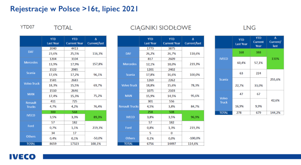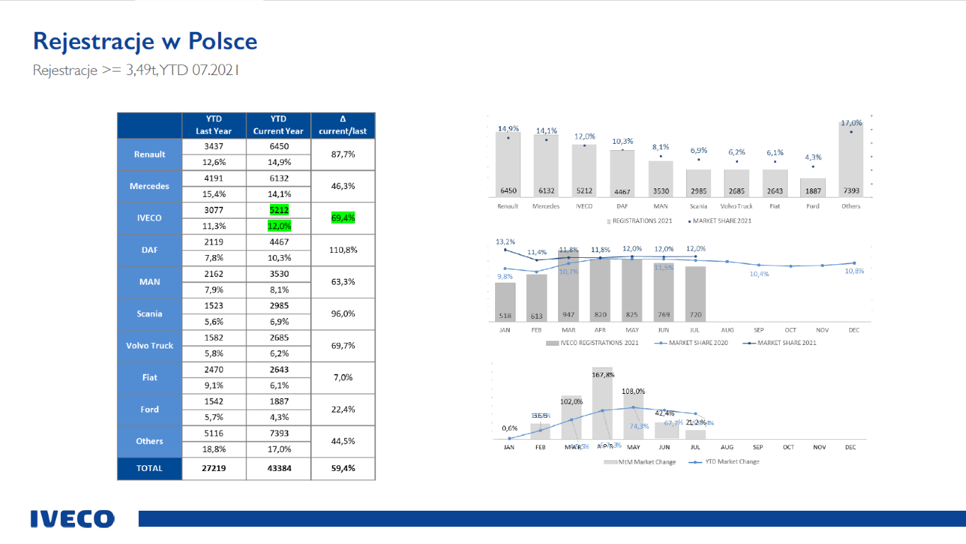 W Polsce rynek pojazdów użytkowych o dmc powyżej 3,49 t odnotował do końca lipca 2021 r. jeszcze większe wzrosty niż miało to miejsce w całej Europie – 59,4% i również tutaj IVECO może się pochwalić wyższym trendem – 69,4%. Marka plasuje się na 3. pozycji z 12% udziałem w rynku, do czego mocno przyczyniła się sprzedaż Daily.