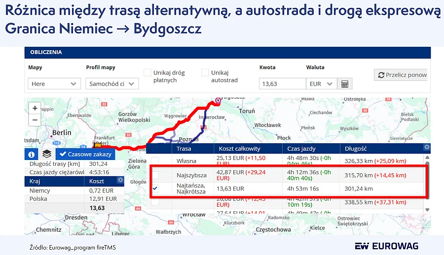 Rosnące koszty autostrad i dróg ekspresowych mogą skłaniać przewoźników do powrotu na drogi krajowe. Na przykład wyliczenia z systemu fireTMS dla trasy z Bydgoszczy do zachodniej, niemieckiej granicy państwa pokazują, że zamiast autostrady można wybrać tańszą do niej alternatywę (drogę 92) i wtedy zaoszczędzić prawie 30 euro (ok. 125 zł w jedną stronę). Przy regularnych przejazdach są to realne korzyści finansowe dla firm. – Taka oszczędność może wydawać się kwotą niską, ale pamiętajmy jednak, że działa tu efekt skali. Firmy z dużą flotą, których pojazdy pokonują miesięcznie tysiące kilometrów płatnymi trasami, mogą liczyć na redukcję kosztów na poziomie nawet kilku tysięcy. Na racjonalnym planowaniu tras i wyborze alternatywnych, tańszych odcinków, zyskuje każda firma, niezależnie od skali działalności. Warto jednak podkreślić to, że ogromne znaczenie ma trzymanie się wcześniej ustalonego planu i przejazd kierowcy wyznaczonym wcześniej korytarzem, co pozwala na to integracja narzędzi TMS z telematycznymi – podkreśla Tomasz Czyż.
