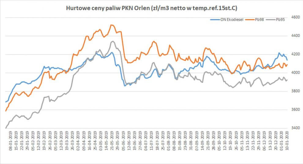 w Orlenie Pb95 0 zł/m3; Pb98 +35 zł/m3; ON/A2 -46 zł/m3; ONG -20 zł/m3 – [SPOT 0/-6];