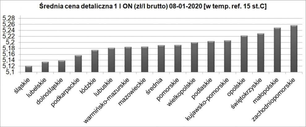 Najtańszy olej napędowy ma woj. śląskie: 5,13 zł/l (+3 gr/l przez ostatnie 7 dni); najdroższy zachodniopomorskie: 5,26 zł/l (+1 gr/l). Największa zmiana ceny detalicznej ON, jaką odnotowujemy w tym tygodniu, to lubelskie: – gr/l przy średniej 5,14 zł/l.