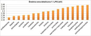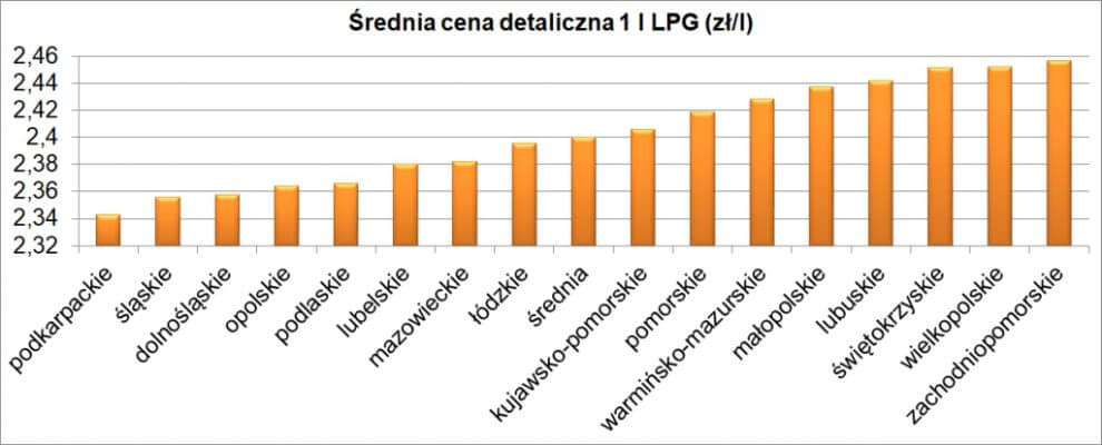 Podkarpackie to najtańszy autogaz: 2,34 zł/l (b.z.), a najdroższy zachodniopomorskie: 2,46 zł/l (-3 gr/l – top zarazem największa zmiana ceny detalicznej LPG, jaką odnotowujemy w tym tygodniu).