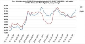 W porównaniu z 3 stycznia 2020 r. ON/ON+, Pb95/98 są dziś droższe 1 gr/l, i LPG powróciło do tamtych notowań (zmiana 0 gr/l).