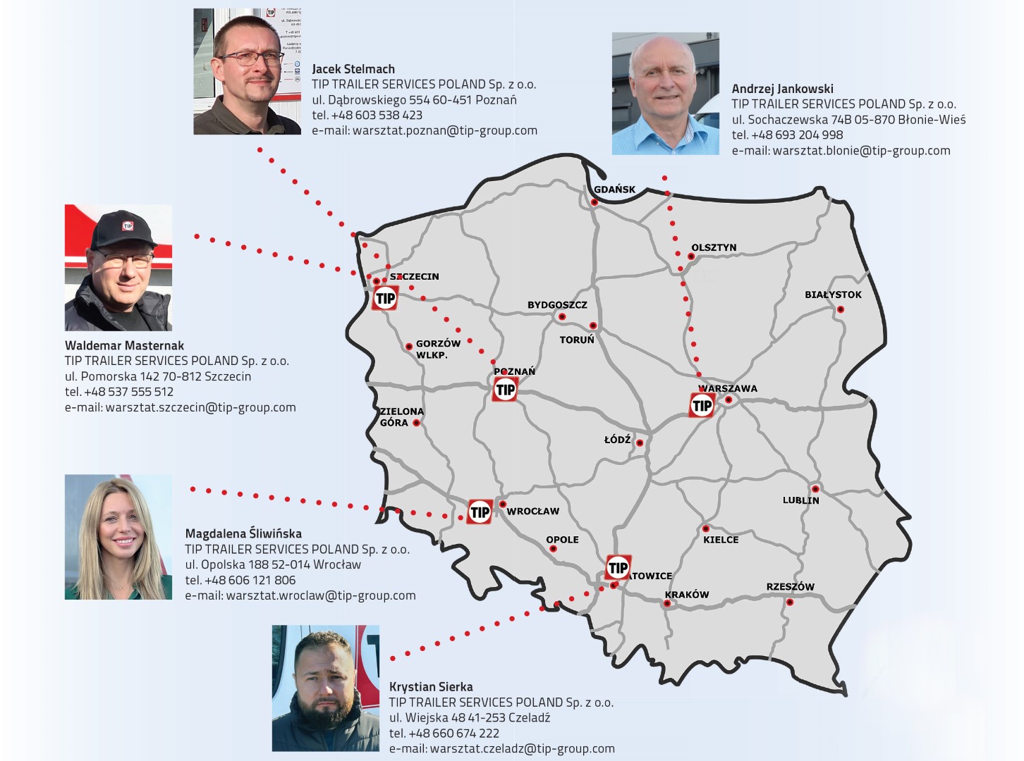 W każdej placówce TIP Group jest mobilny warsztat. Służy do usuwania awarii w drodze lub obsługi na placu u klienta.