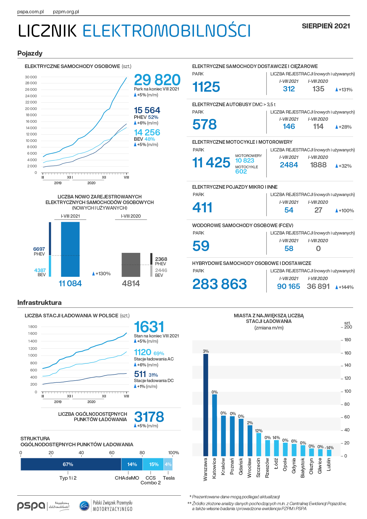 Wraz ze wzrostem liczby pojazdów z napędem elektrycznym, rozwija się również infrastruktura ładowania. Pod koniec sierpnia w Polsce funkcjonowało 1631 ogólnodostępnych stacji ładowania pojazdów elektrycznych (3 178 punktów). 31% z nich stanowiły szybkie stacje ładowania prądem stałym (DC), a 69% – wolne ładowarki prądu przemiennego (AC) o mocy mniejszej lub równej 22 kW. W sierpniu uruchomiono 74 nowe, ogólnodostępne stacje ładowania (141 punktów).