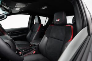 W środku wersję tę wyróżniają nowe sportowe fotele skórzane z perforacją, czerwonym przeszyciem i emblematem GR na zagłówkach. Logotypy GR Sport są umieszczone na fotelach, dywanikach, przycisku Start, a także w formie animacji graficznej na wyświetlaczu. Kierowca może korzystać z łopatek do zmiany biegów, skórzana kierownica ma czerwone obszycie, a sportowe pedały wykonano z aluminium. Wstawki nawiązujące do włókna węglowego dodają rasowego charakteru, podobnie jak czerwona listwa dekoracyjna poprowadzona w poprzek kokpitu czy niebieskie podświetlenie panelu drzwi. Przestrzeń ładunkową można przesłonić elektrycznie sterowaną roletą w kolorze czarnym.