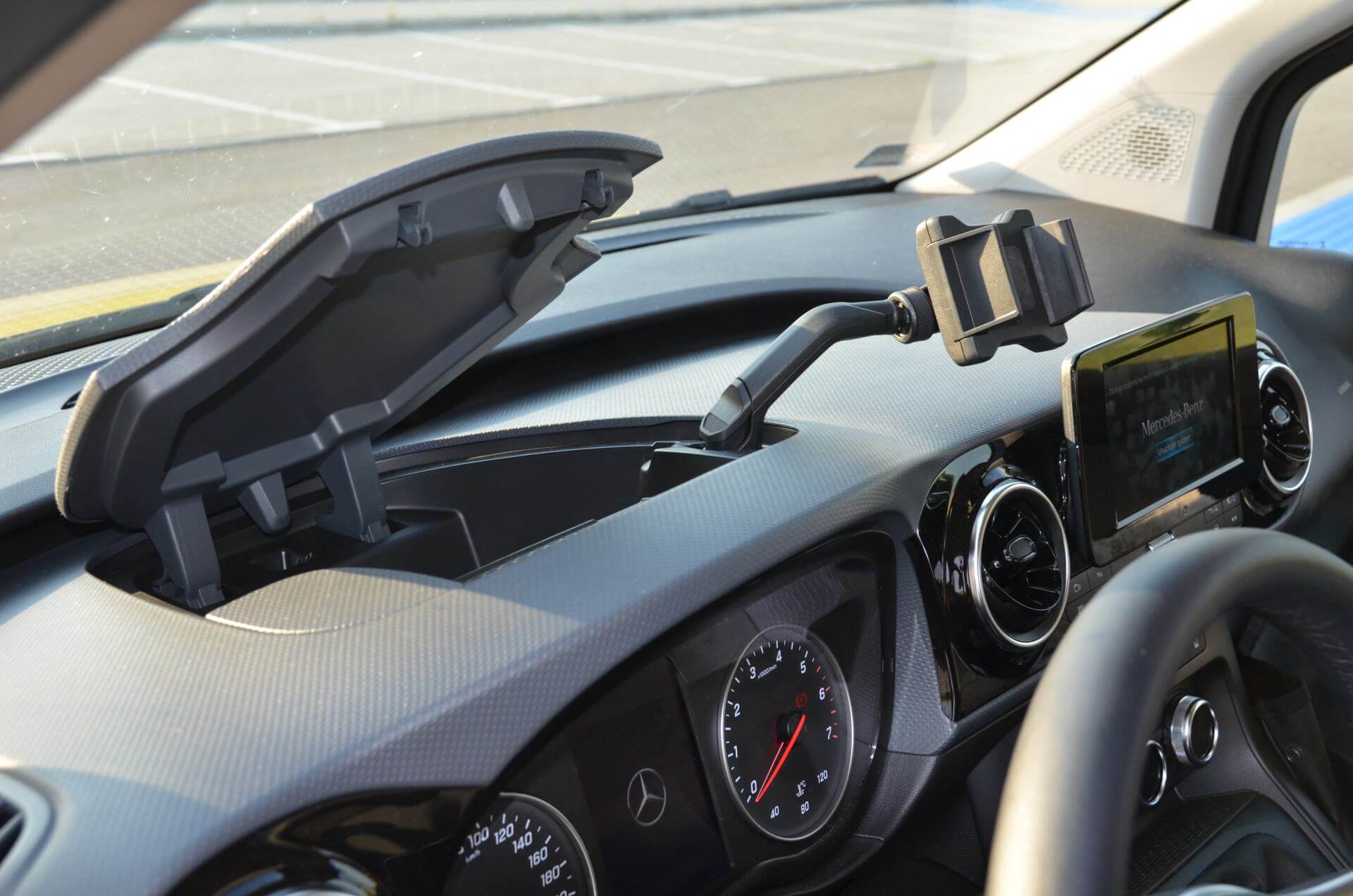Miejsce kierowcy jest wygodne i ergonomiczne. Za kierownicą, pod szybą znajduje się zamykany schowek z gniazdem USB C. Można tam też zamocować opcjonalny uchwyt na telefon: z prawej bądź lewej strony.