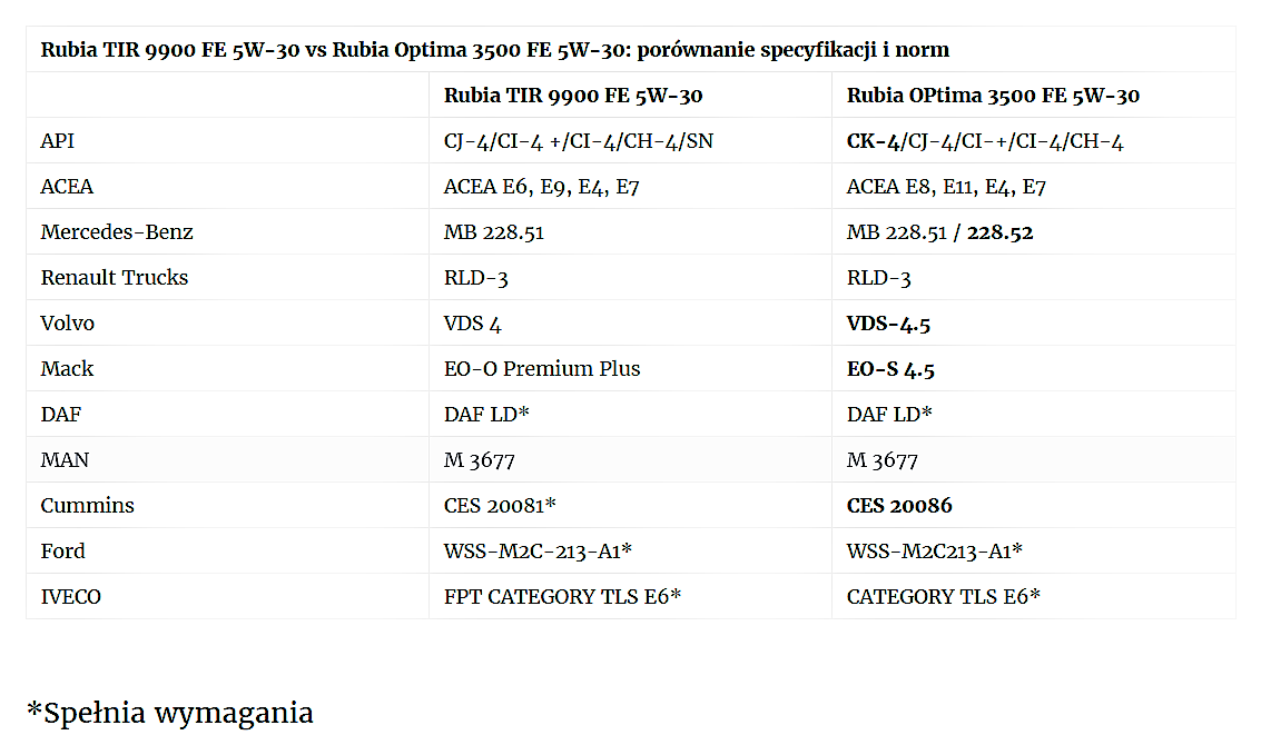 Gama olejów Rubia Optima spełniająca normę API CK-4 to wejście na zupełnie nowy poziom w technice środków smarnych i duży przeskok technologiczny w stosunku do starszych produktów z API CJ-4. Wprowadzane oleje są niezbędne dla najnowszych silników, ale doskonale nadają się także do starszych konstrukcji. Dzięki specyfikacji API CK-4 + ACEA E8, E11 i najwyższej homologacji, Rubia Optima 3500 FE 5W-30 ma bardzo szerokie zastosowanie. Spełniając zróżnicowane wymagania wielu producentów silników, z łatwością nadaje się do zastosowania przy obsłudze całych flot najnowszych pojazdów ciężarowych. Skutecznie zastępuje także starsze, sprawdzone środki smarne, np. bardzo popularny olej Rubia TIR 9900 FE 5W-30.