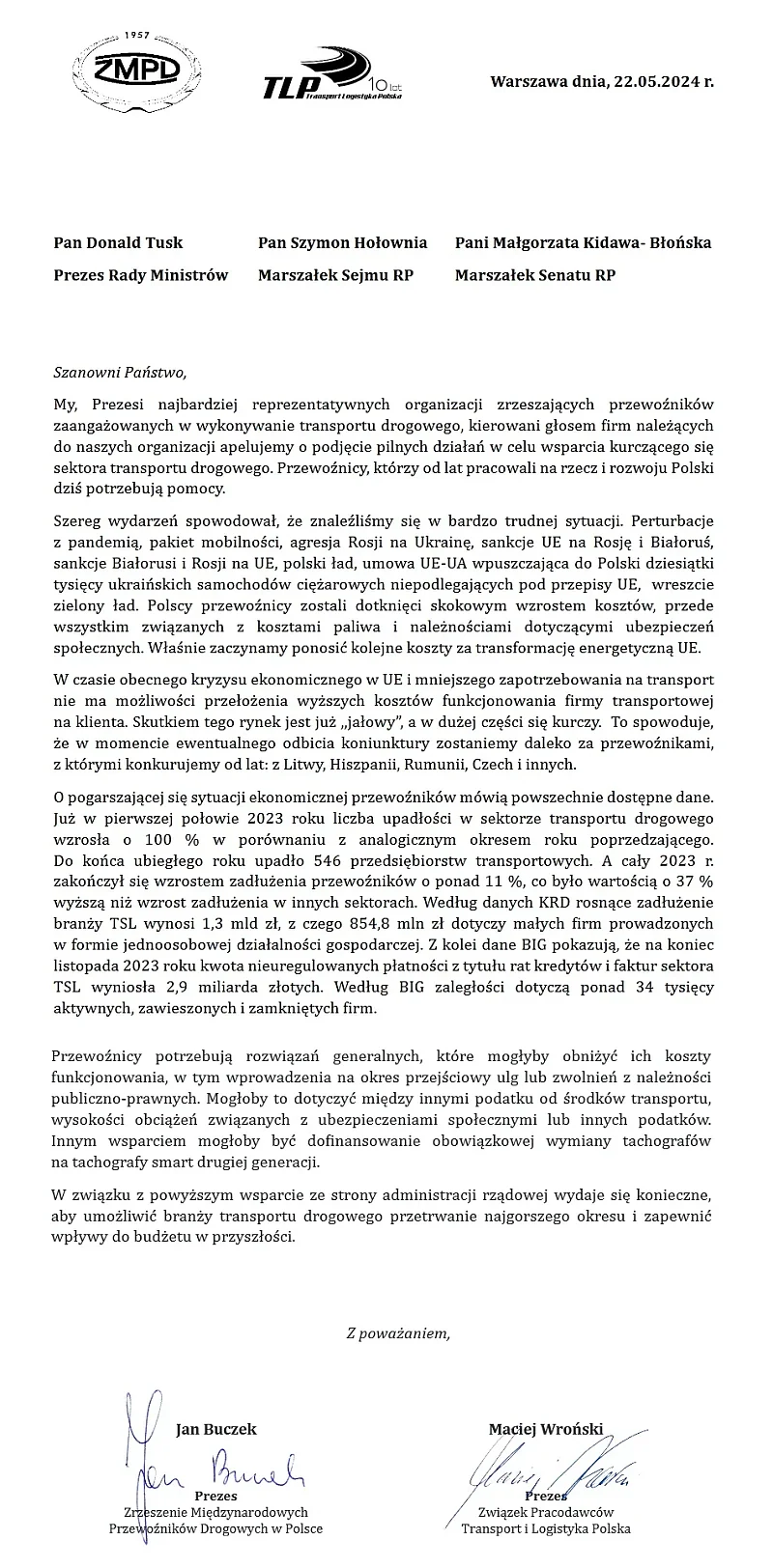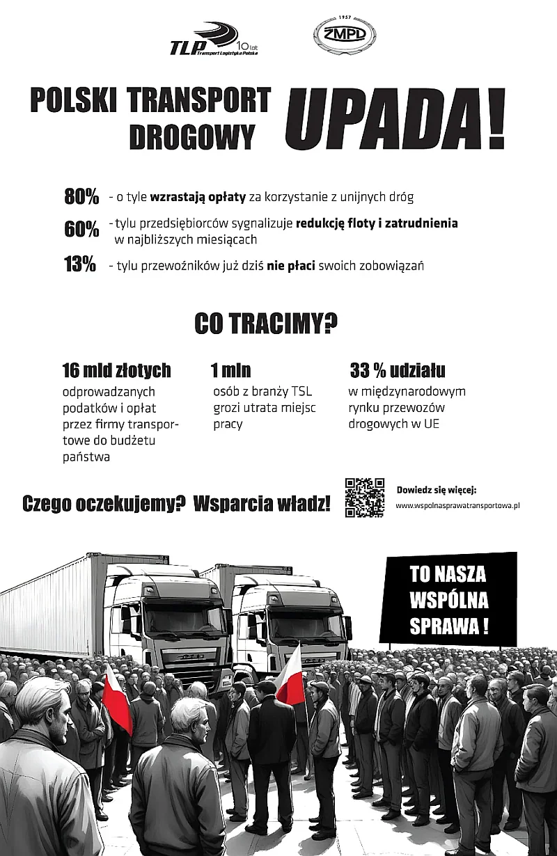 W obliczu kumulacji niezwykle wyraźnych zagrożeń dla sektora polskiego transportu drogowego (stanowiącego istotny filar rozwoju gospodarczego naszego kraju) dwie największe organizacje zrzeszające przewoźników: Związek Pracodawców Transport i Logistyka Polska oraz Zrzeszenie Międzynarodowych Przewoźników Drogowych, występują ze wspólnym apelem do polskich władz o podjęcie realnych działań pomocowych.