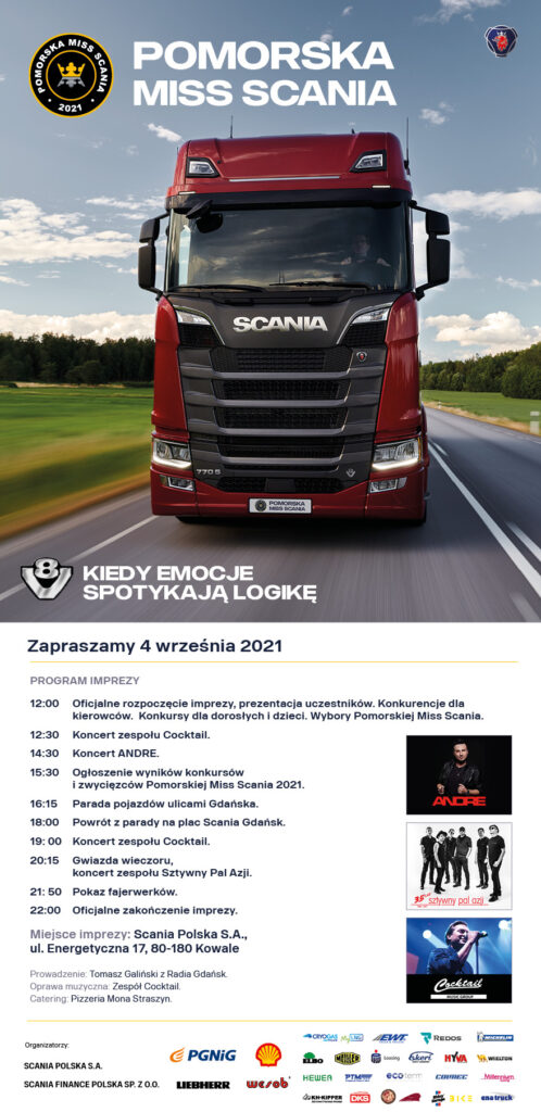 Podczas „Pomorskiej Miss Scania 2021” nie zabraknie koncertów, konkursów oraz atrakcji dla najmłodszych. Impreza zostanie zwieńczona paradą Scanii głównymi ulicami Gdańska w asyście policji.