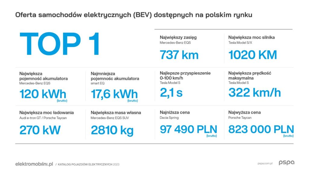 W polskich salonach dostępnych jest łącznie 108 modeli pojazdów elektrycznych, w tym 83 osobowe i 25 dostawczych. Spośród nich 73% modeli umożliwia ładowanie z mocą wyższą niż 50 kW (51-350 kW). Największe zasięgi mają auta klasy wyższej (571 km) oraz luksusowej (510 km). Modele klasy średniej mogą przebyć 496 km.