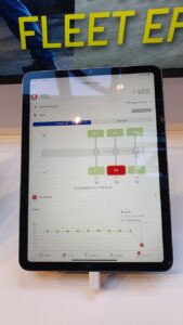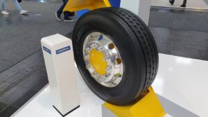 W Hanowerze prezentujemy nasze główne rozwiązania flotowe składające się z najnowocześniejszych opon, ale przede wszystkim z systemów do zarządzania flotą pojazdów ciężarowych. Przy okazji można też zobaczyć, jak działa jedno z naszych flagowych urządzeń do mierzenia ciśnienia i głębokości bieżnika w oponach – Goodyear CheckPoint. To najczęściej wybierane rozwiązanie przez naszych klientów. Zastosowano w nim dwie technologie. Gdy pojazd przejeżdża przez punkt kontrolny, laser naświetla oponę i w ten sposób jest mierzona głębokość bieżnika. Układ kamer zbiera dane i je przelicza, dostarczając informacje, które są dostępne w programie komputerowym lub aplikacji mobilnej. Za pomocą tego urządzenia mierzymy też ciśnienie w oponach w czasie rzeczywistym na każdej pozycji koła. Mierzona jest waga pojazdu i na podstawie nacisku poszczególnych kół oraz odcisku opony wyznaczany jest poziom ciśnienia. Przez punkt kontrolny trzeba oczywiście przejechać z odpowiednią prędkością, ok. 10 km/h. Dzięki temu osoba zarządzająca taborem może, za pośrednictwem przeznaczonej do tego aplikacji, w czasie rzeczywistym mieć wgląd w aktualny stan opon w całej flocie, która przez to urządzenie przejechała. To rozwiązanie nie wymaga montażu czujników, ani nadajników na oponie, co znacznie upraszcza jego użytkowanie. Zebrane dane to doskonała i szybka inspekcja pozwalająca na zarządzanie oponami w sposób gwarantujący maksymalizację przebiegu, dbałość o środowisko i minimalizację kosztów operacyjnych floty.