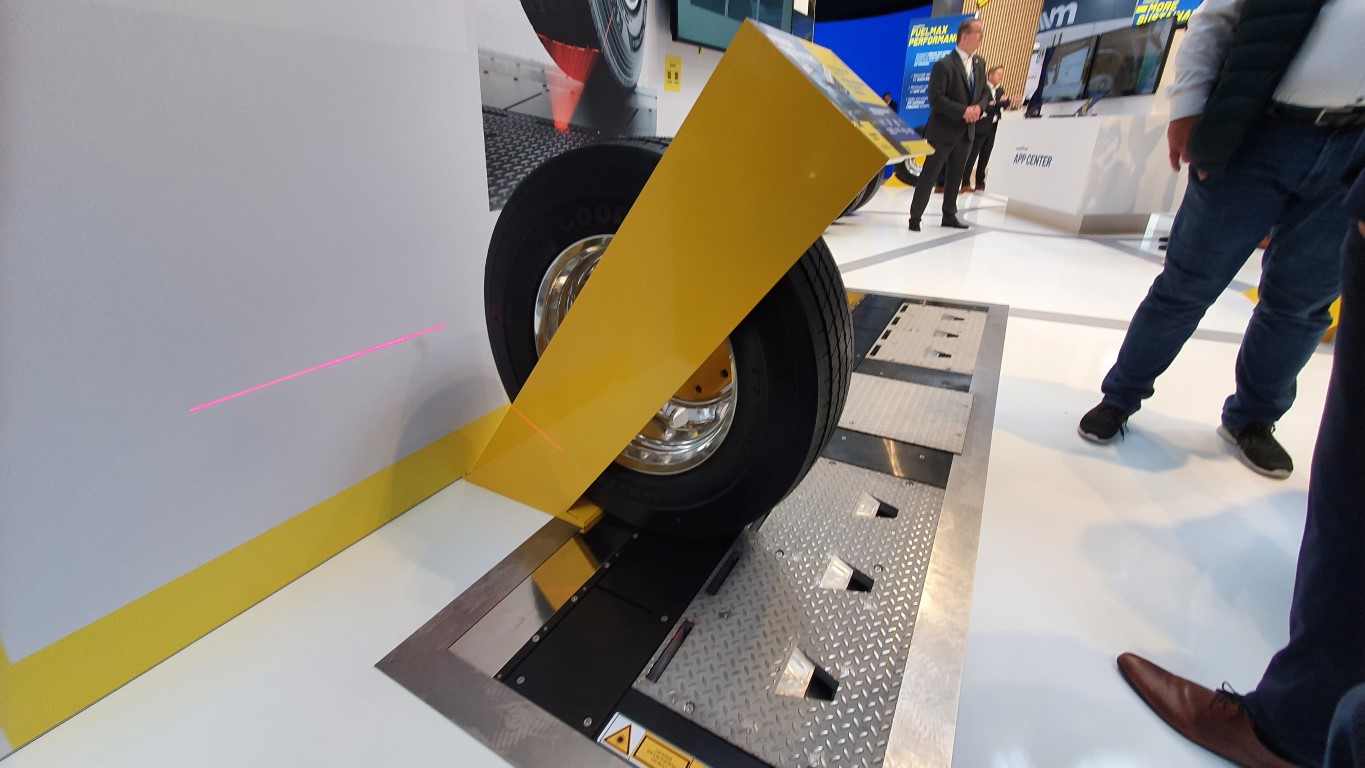 W Hanowerze prezentujemy nasze główne rozwiązania flotowe składające się z najnowocześniejszych opon, ale przede wszystkim z systemów do zarządzania flotą pojazdów ciężarowych. Przy okazji można też zobaczyć, jak działa jedno z naszych flagowych urządzeń do mierzenia ciśnienia i głębokości bieżnika w oponach – Goodyear CheckPoint. To najczęściej wybierane rozwiązanie przez naszych klientów. Zastosowano w nim dwie technologie. Gdy pojazd przejeżdża przez punkt kontrolny, laser naświetla oponę i w ten sposób jest mierzona głębokość bieżnika. Układ kamer zbiera dane i je przelicza, dostarczając informacje, które są dostępne w programie komputerowym lub aplikacji mobilnej. Za pomocą tego urządzenia mierzymy też ciśnienie w oponach w czasie rzeczywistym na każdej pozycji koła. Mierzona jest waga pojazdu i na podstawie nacisku poszczególnych kół oraz odcisku opony wyznaczany jest poziom ciśnienia. Przez punkt kontrolny trzeba oczywiście przejechać z odpowiednią prędkością, ok. 10 km/h. Dzięki temu osoba zarządzająca taborem może, za pośrednictwem przeznaczonej do tego aplikacji, w czasie rzeczywistym mieć wgląd w aktualny stan opon w całej flocie, która przez to urządzenie przejechała. To rozwiązanie nie wymaga montażu czujników, ani nadajników na oponie, co znacznie upraszcza jego użytkowanie. Zebrane dane to doskonała i szybka inspekcja pozwalająca na zarządzanie oponami w sposób gwarantujący maksymalizację przebiegu, dbałość o środowisko i minimalizację kosztów operacyjnych floty.