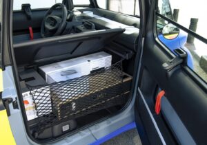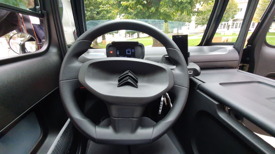 Kierowca ma dość mało miejsca. To opcja raczej dla filigranowych. Zamiast systemu multimedialnego, jest wygodny uchwyt na telefon z gniazdem USB. Tryby jazdy przełącza się za pomocą przycisków umieszczonych z boku fotela. Nietypowo też są zamontowane drzwi. Od strony kierowcy zamykają się „pod wiatr”, a od strony ładunkowego boksu (pasażera) w sposób tradycyjny. Zamiast klamek zastosowano taśmy, za które pociągamy, chcąc zamknąć bądź otworzyć samochód od środka.