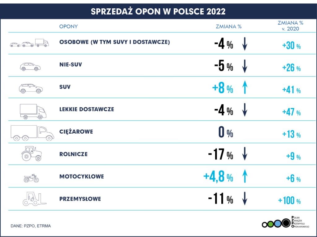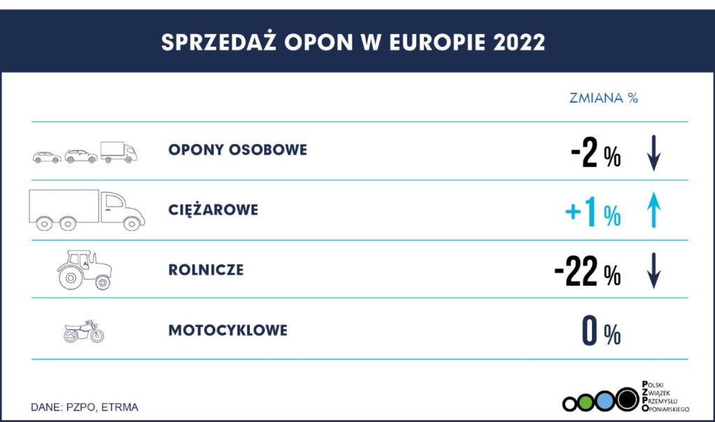 Jeśli chodzi o cały rynek europejski to segment opon konsumenckich odnotował spadek o 2% w 2022 r. w porównaniu do 2021 r., przy spadku o 10,1% w ciągu ostatnich sześciu miesięcy. Rynek opon do samochodów ciężarowych i autobusów pozostał stabilny (+1%), pomimo gwałtownego spadku o 8,2% w drugiej połowie roku. Podobny trend widać również w segmencie opon motocyklowych, gdzie sprzedaż pozostała stabilna, pomimo spadku w ostatnim kwartale o 11%. Opony rolnicze odnotowały ujemne wartości przez cały rok, co spowodowało łączny spadek o 22%. W przypadku opon z oryginalnego wyposażenia (OE) wyniki na koniec roku są nieco bardziej pozytywne, przy wzroście sprzedaży opon konsumenckich o 3,4% oraz o 4,7% w przypadku samochodów ciężarowych i autobusów. W porównaniu z 2019 r. sprzedaż opon OE do samochodów ciężarowych i autobusów wzrosła o 6,8%. Opony do samochodów osobowych OE pozostają nadal poniżej poziomu sprzed pandemii (-26%).