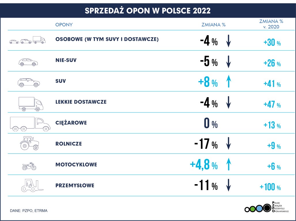 W czwartym kwartale dane były mniej optymistyczne. Rosła sprzedaż tylko w segmencie opon ciężarowych (+1%), bez zmian była do SUV-ów. Pozostałe segmenty zanotowały głębokie spadki: opony do samochodów osobowych -18%, dostawczych -10%, do maszyn rolniczych -33%, przemysłowe -28%, a motocyklowe -22,3%
