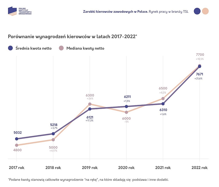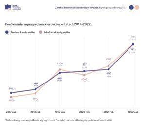 • pomimo zawirowań gospodarczych w 2022 roku, średnia pensja netto kierowców wzrosła o 21,6% w stosunku do roku poprzedniego;