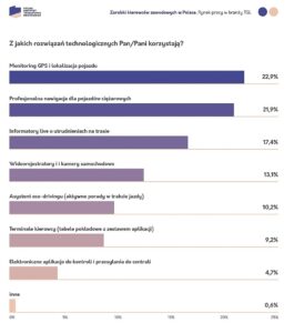 Przeważająca część respondentów, około 72% kierowców, posługuje się nowoczesnymi systemami technologicznymi. Pośród najpopularniejszych z nich prym wiedzie nadal podstawowa telematyka w postaci monitoringu GPS i lokalizacji pojazdów – około 23%. Ponadto w pierwszej trójce znalazły się urządzenia nawigacyjne opracowane z myślą o samochodach ciężarowych oraz system rozpoznawania przeszkód na trasie, odpowiednio około 22% i 17%. Ze wszystkich omawianych technologii najmniejszy odsetek odpowiedzi kierowców stanowiły terminale dla kierowców (tablety pokładowe wyposażone w zestaw aplikacji), jak również aplikacje cyfrowe przeznaczone do sprawdzania i przekazywania do centrali wyników pracy pojazdu – mniej niż 1 na 10 wskazań.